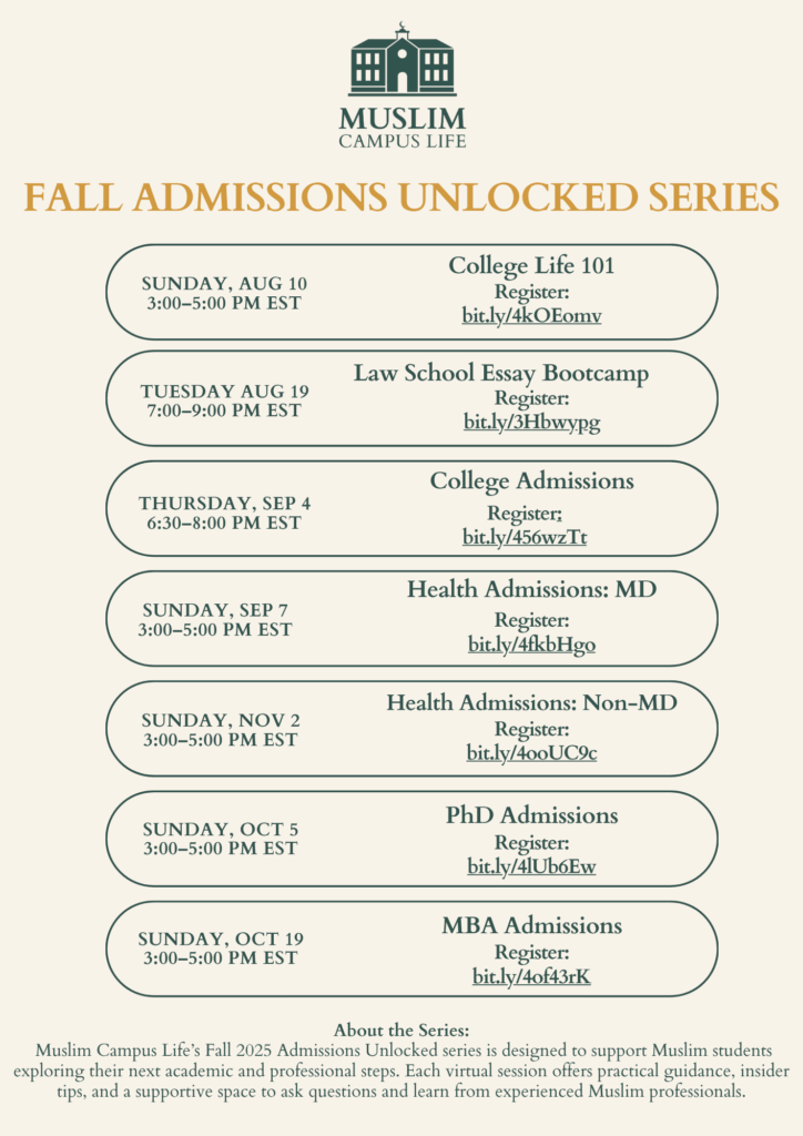 Launching the Fall 2025 Admissions Unlocked Series https://www.muslimcampuslife.com/2025/07/25/launching-the-fall-2025-admissions-unlocked-series/ Fri, 25 Jul 2025 14:15:06 +0000 https://www.muslimcampuslife.com/?p=2535 Read More »Launching the Fall 2025 Admissions Unlocked Series]]> This fall, Muslim Campus Life will host the Fall 2025 Admissions Unlocked Series, a virtual webinar lineup created to help Muslim students navigate their next steps in higher education with clarity and confidence. From August through November, we will bring together informed mentors, experienced graduate students, and Muslim professionals to share practical guidance and demystify the admissions process across multiple academic pathways.
